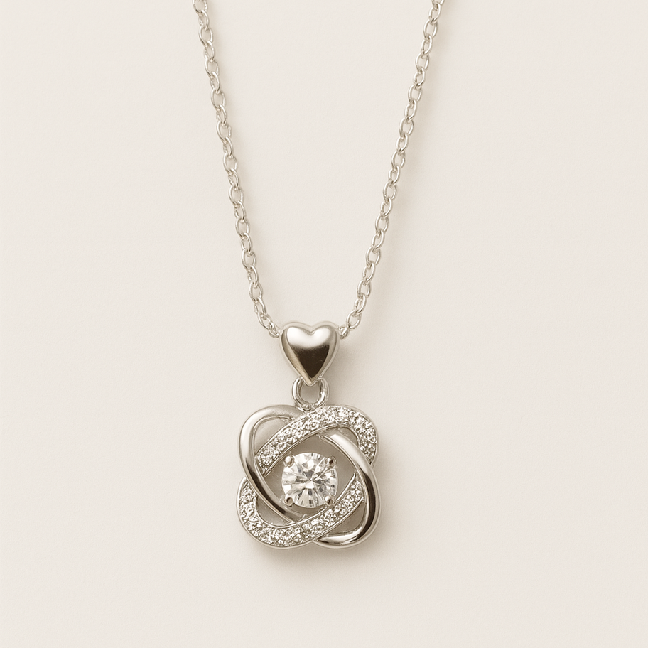 Celebrate a love that's forever in bloom with our exquisite Elysian Knot Pendant. A timeless symbol of devotion, this beautiful 925 Sterling Silver necklace features an intricate 'lover's knot' of four sparkling, pavé-set loops that resemble the petals of a rose. Nestled at the heart of this knot is a single, brilliant solitaire stone that catches the light beautifully. This deeply romantic and elegant pendant is a perfect way to express your eternal affection and makes a cherished gift for someone you love.
