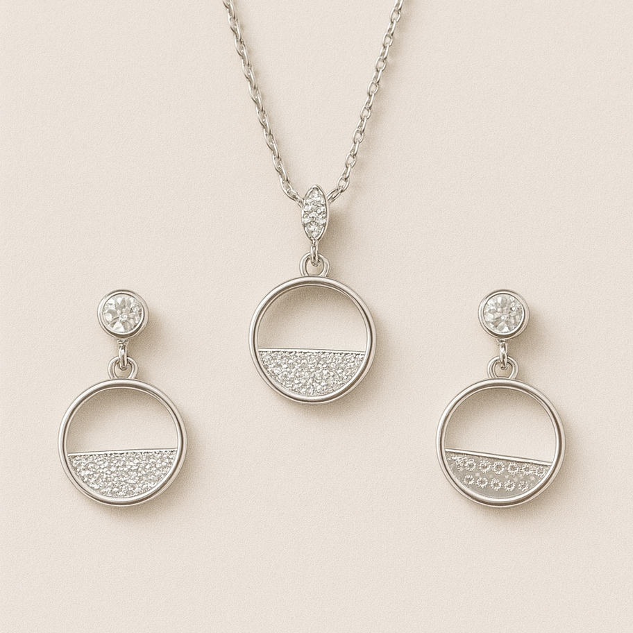 Embrace modern minimalism with our beautifully chic Meridian Set. Crafted from 925 Sterling Silver, this matching set features a pair of dangle earrings and a coordinating pendant, each with a perfect open circle. The lower half of this circle is defined by a 'horizon' bar, brilliantly encrusted with sparkling pavé-set stones, while the earrings are topped with a single solitaire stud for added elegance. This sophisticated and versatile set is perfect for adding a touch of contemporary sparkle to any look, day or night.